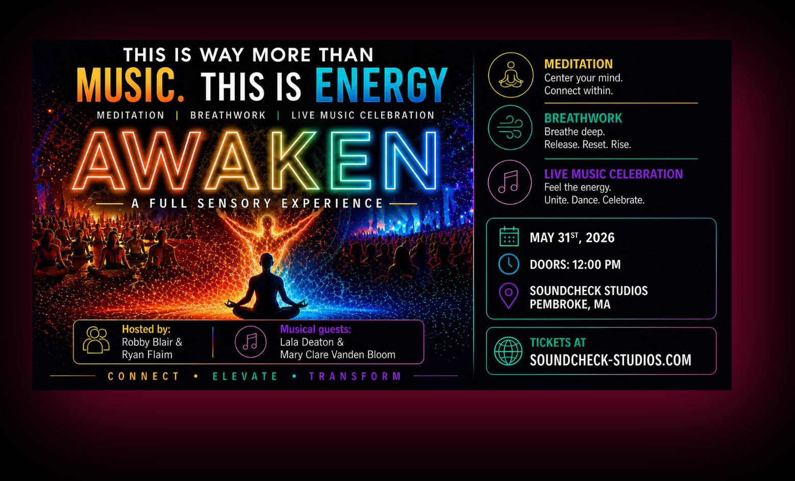 AWAKEN is where embodied practice meets high-vibration sound. We fuse Robby Blair's original music —a source of inspirational lyrical affirmations—with immersive QuantumScope visualizations and curated breathwork journeys. It's a remembering of the way we are meant to hear, see, feel and know through music.